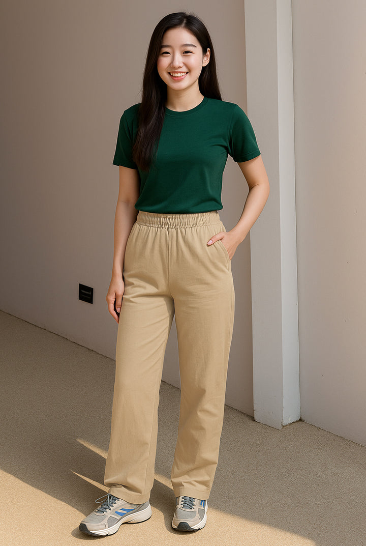 CRAFTED FOR EVERYDAY COMFORT AND EASE, THESE LOWERS ARE BREATHABLE, LIGHTWEIGHT, AND SOFT ON THE SKIN. THE COTTON FABRIC ALLOWS SMOOTH AIR CIRCULATION, KEEPING YOU COOL AND FRESH ALL DAY. ADDED LYCRA GIVES THE PERFECT.STRETCH FOR UNRESTRICTED MOVEMENT AND A FLATTERING FIT. RETAINS SHAPE AFTER EVERY WEAR—NO SAGGING OR BAGGING. IDEAL FOR DAILY WEAR, LOUNGING, OR TRAVEL.