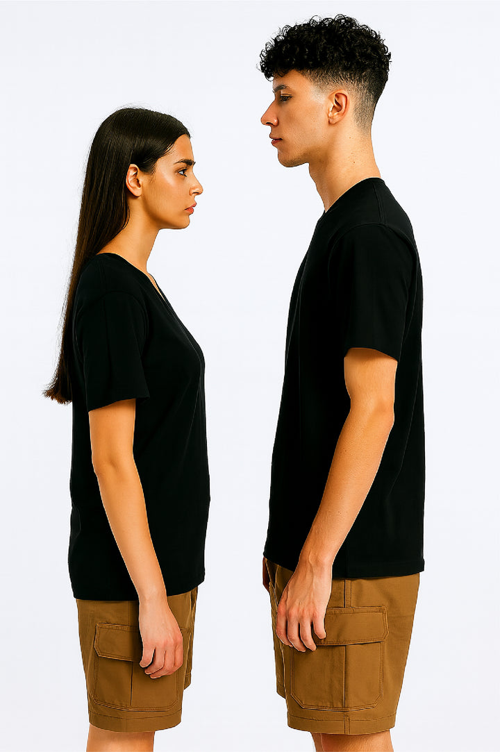 This unisex V-neck T-shirt is crafted from premium cotton lycra fabric, combining the softness and breathability of cotton with the stretch and flexibility of lycra for all-day comfort and a perfect fit. Designed to suit everyone, it offers a clean, modern neckline that flatters all face shapes. Whether worn on its own or layered, this versatile tee is ideal for everyday wear, outdoor activities, or casual outings.