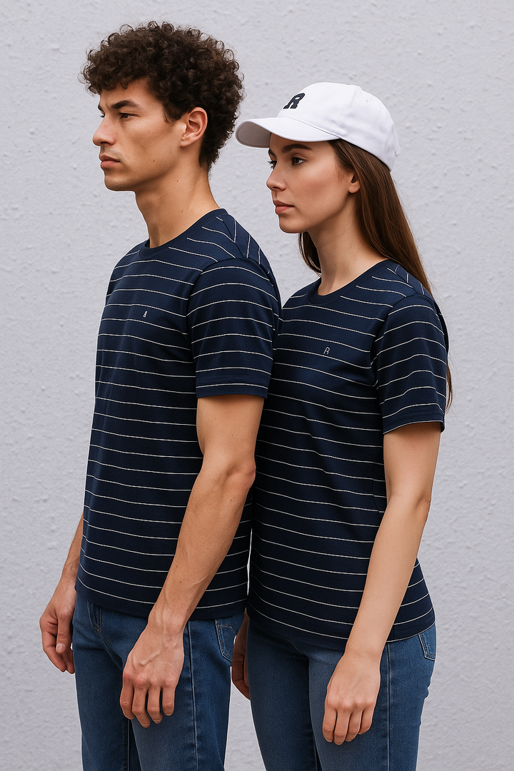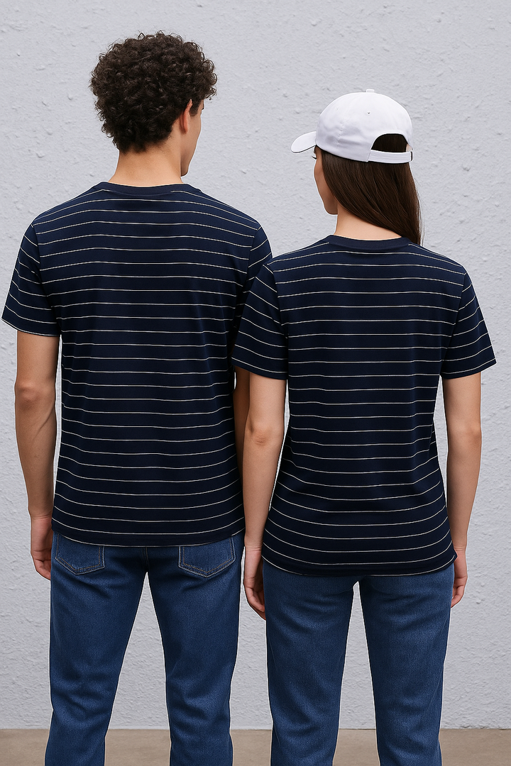 Redefine everyday style with the Timeless Round Neck Stripes Unisex T-Shirt — a perfect balance of modern design and effortless comfort. Crafted to suit every wardrobe, this versatile piece features bold pinstripes that bring a classic yet contemporary edge to any look. Made from Single Jersey Feeder Stripes fabric, it delivers a soft cotton feel and a sleek, flattering fit for everyone. Whether you’re dressing up for a smart-casual outing or keeping it relaxed, this unisex essential offers the perfect blend of comfort, versatility, and timeless appeal.