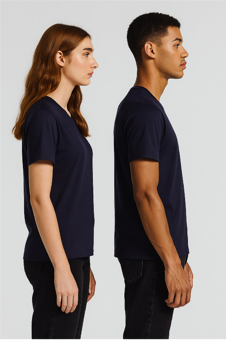 This unisex V-neck T-shirt is crafted from premium cotton lycra fabric, combining the softness and breathability of cotton with the stretch and flexibility of lycra for all-day comfort and a perfect fit. Designed to suit everyone, it offers a clean, modern neckline that flatters all face shapes. Whether worn on its own or layered, this versatile tee is ideal for everyday wear, outdoor activities, or casual outings.